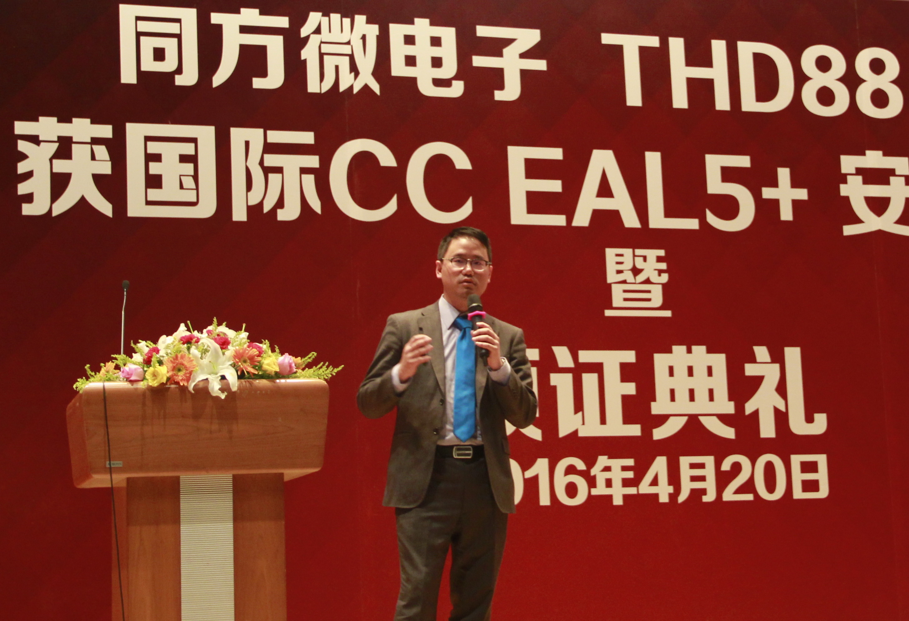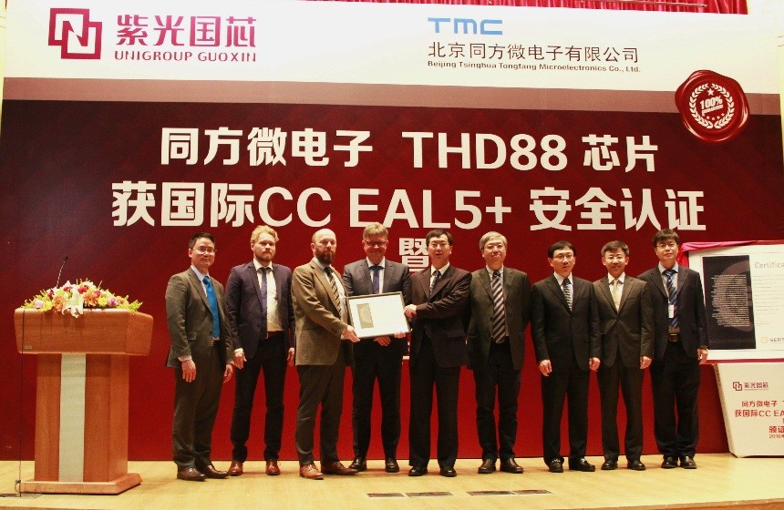 2016年4月20日,北京同方微电子有限公司(以下简称“同方微电子”)在北京清华同方科技广场C座国际报告厅召开CCEAL5+颁证典礼,挪威SERTIT安全认证部主任Kjartan正式向同方微电子总裁段立颁发了国际CCEAL5+安全认证证书,标志着公司自主研发的双界面金融IC卡芯片THD88/M2064(以下简称“THD88”)成为国内唯一一款获得该认证的芯片产品。星空电竞股份有限公司(原名:同方国芯电子股份有限公司)领导、挪威SERTIT认证机构代表、荷兰Brightsight实验室代表、30多家合作伙伴代表、同方微电子公司全体员工共三百余人一起见证了这一历史时刻。
